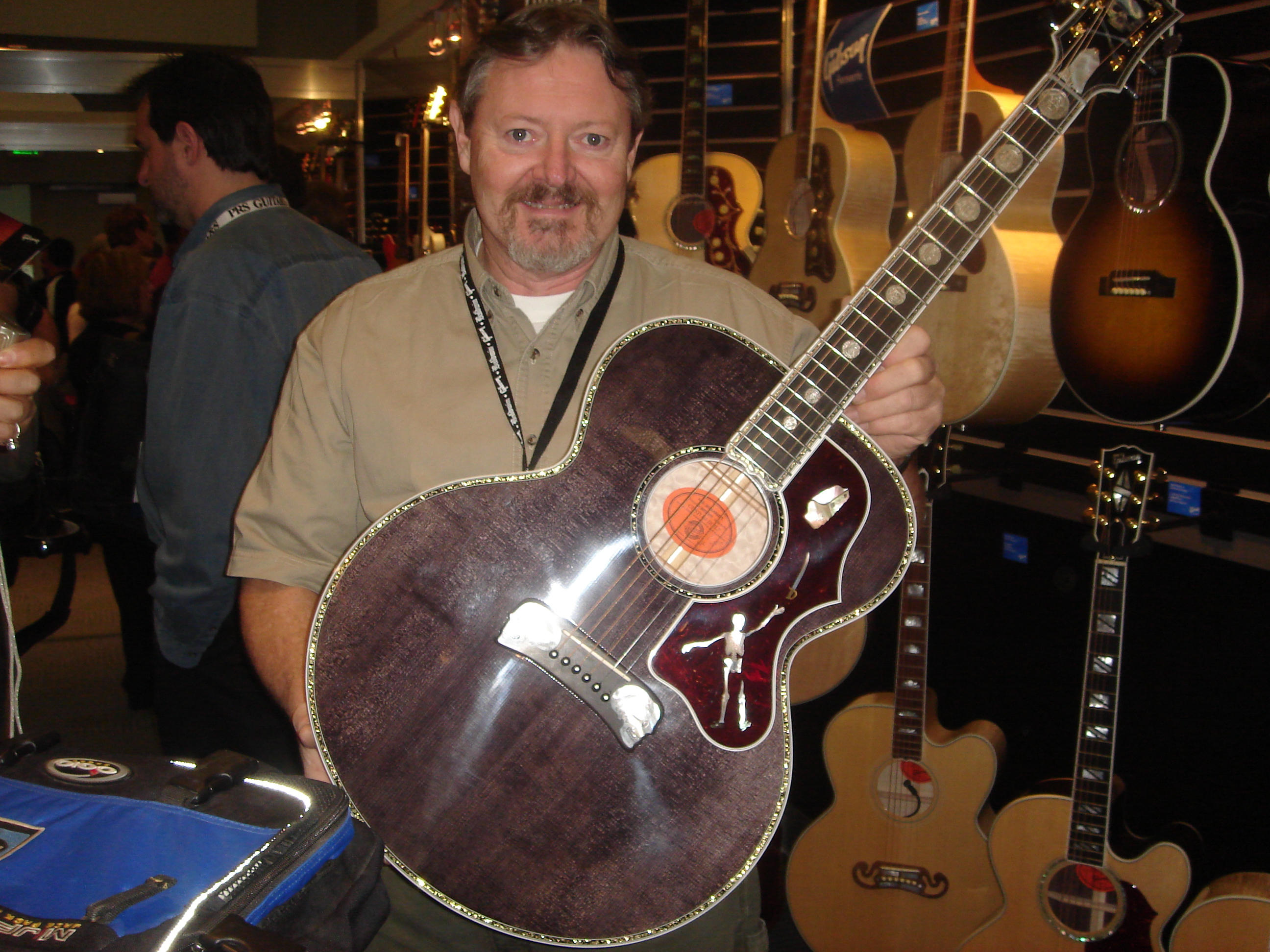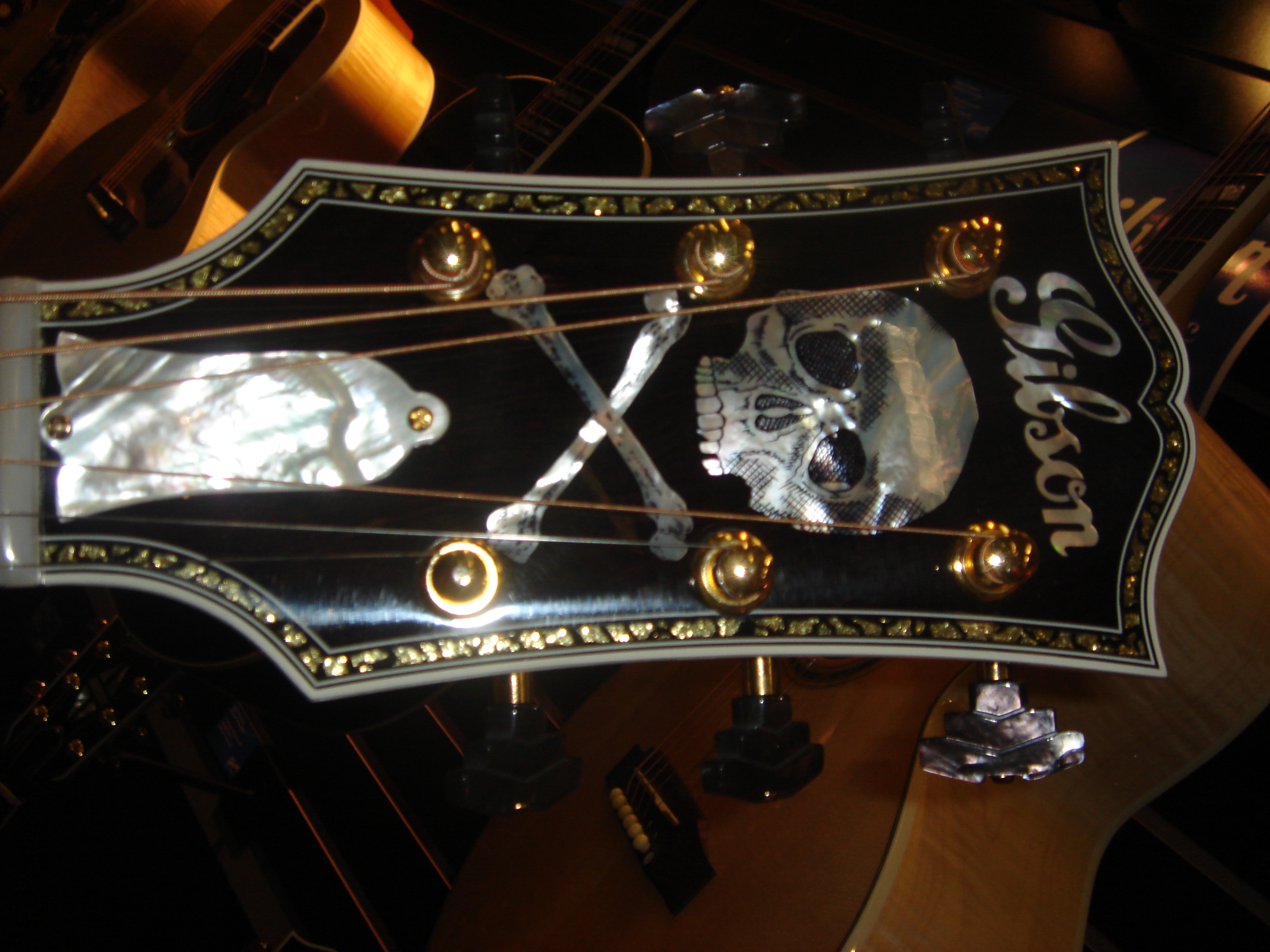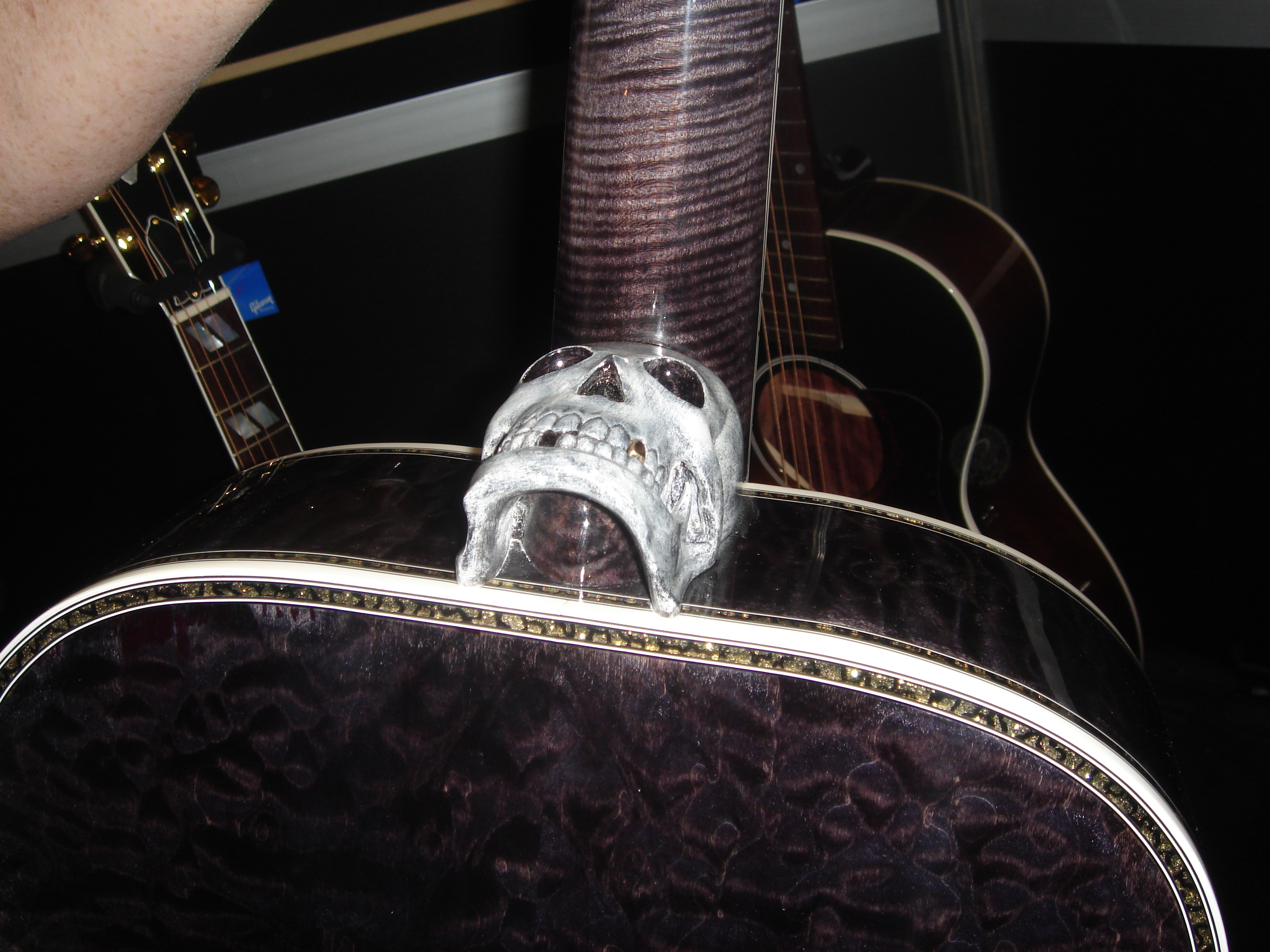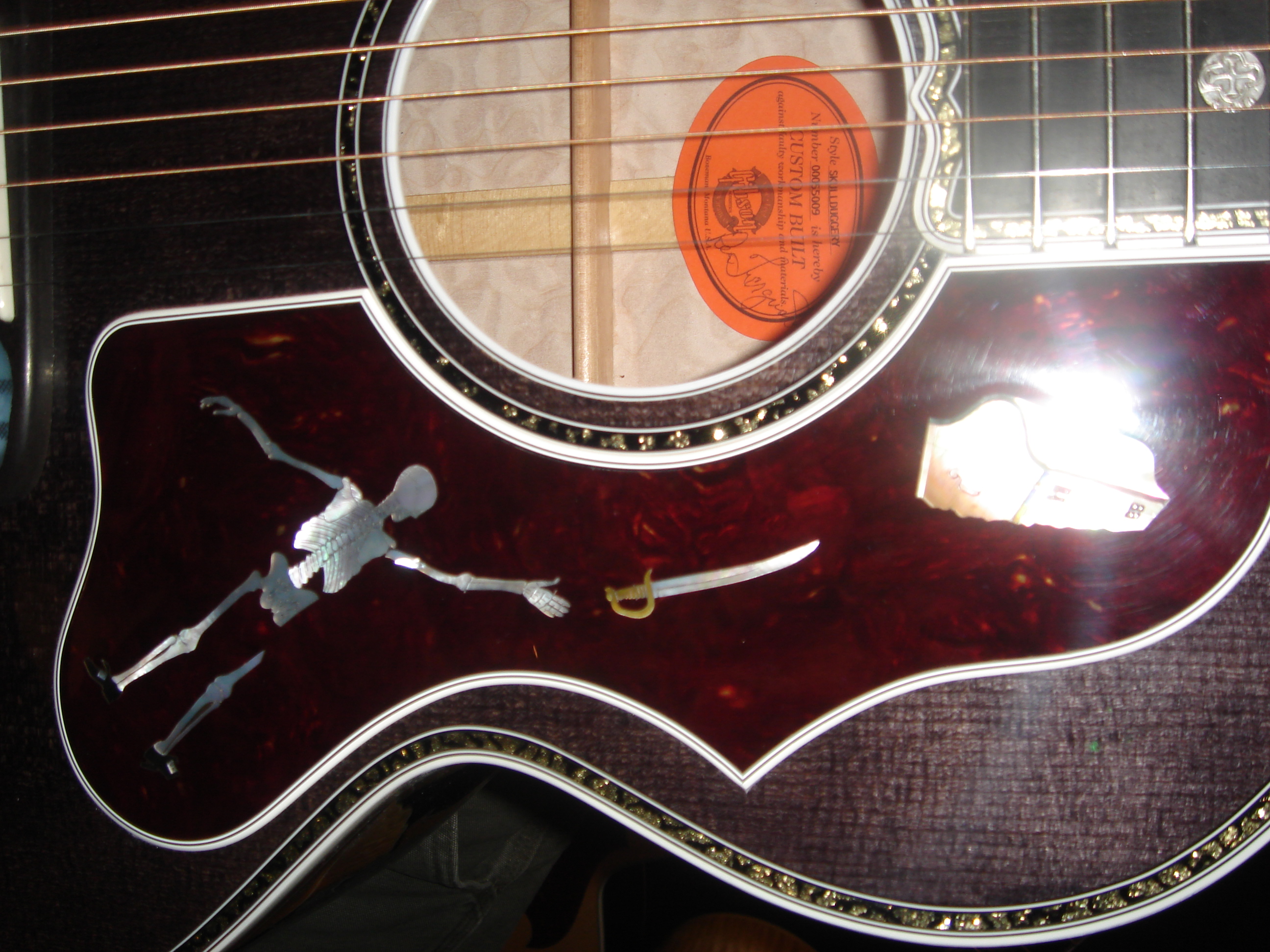 A pirate themed guitar complete with a hand carved skull at the heel. I’ve always loved making these guitars and each tells their own story
